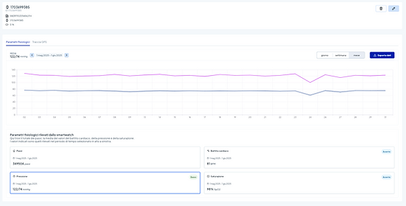La Dashboard integra e processa i dati fisiologici, ambientali e comportamentali, offre previsioni personalizzate, allarmi mirati e traiettorie di fragilità, così da anticipare i rischi e supportare caregiver e professionisti.